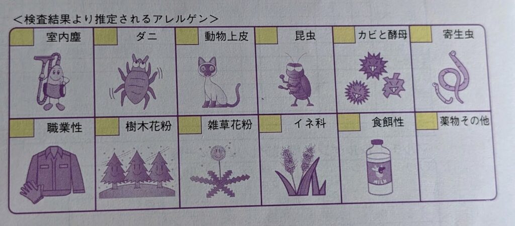 塵、ダニ、動物上皮、昆虫、カビと酵母、寄生虫、職業性、樹木花粉、雑草花粉、イネ科、食餌性、薬物その他とのこと。
