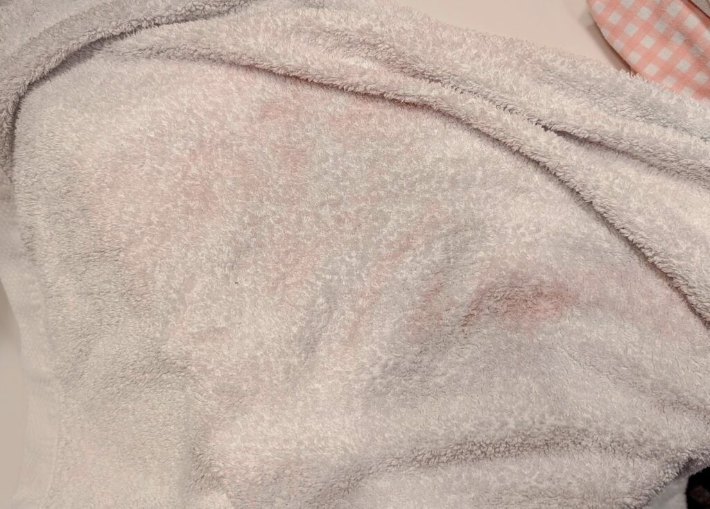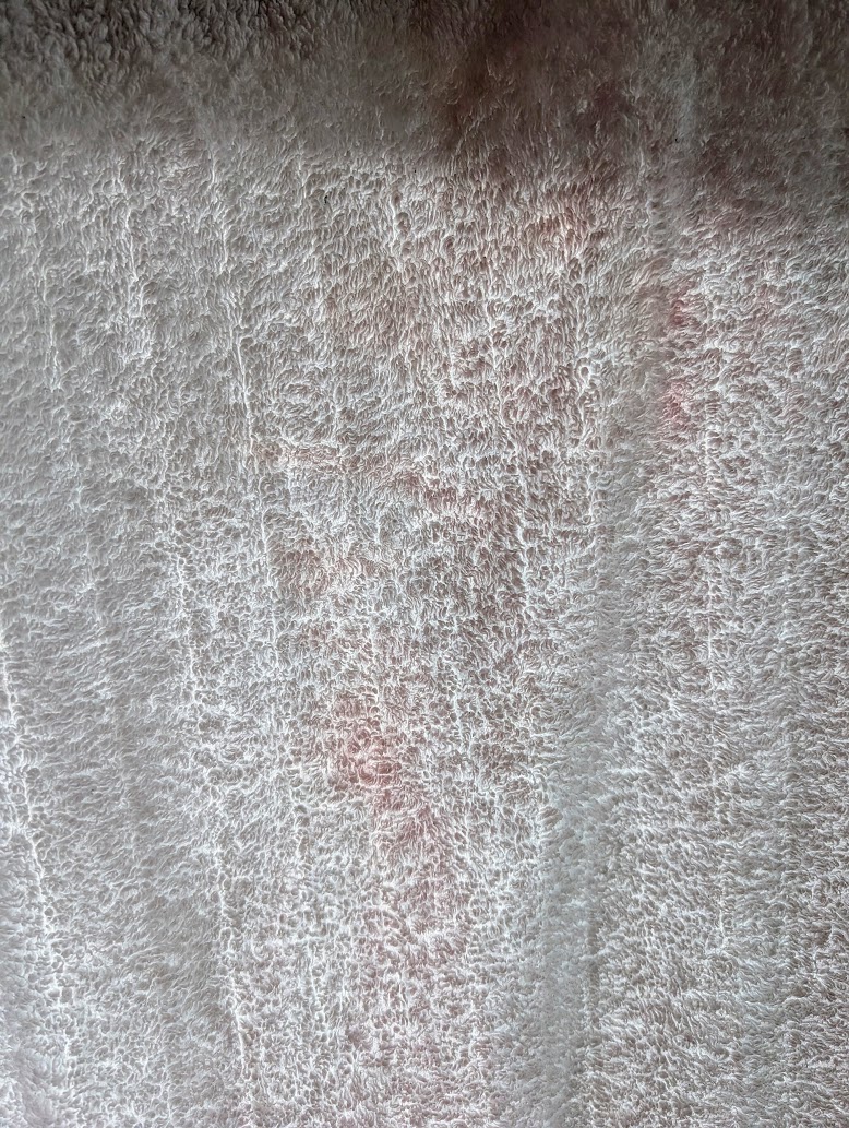 うっすらですが、ピンクで汚れて、美容室のタオルみたいです。