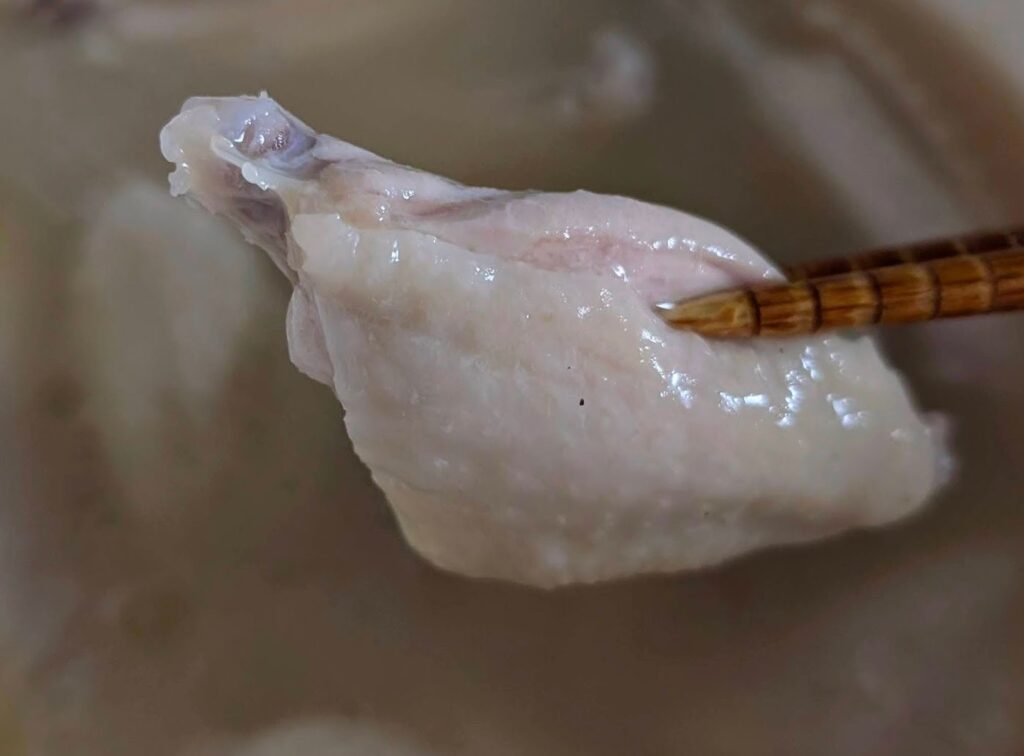 できたお肉は、スープなしで、皮を剥いでお肉だけにして子供にもあげてみました。