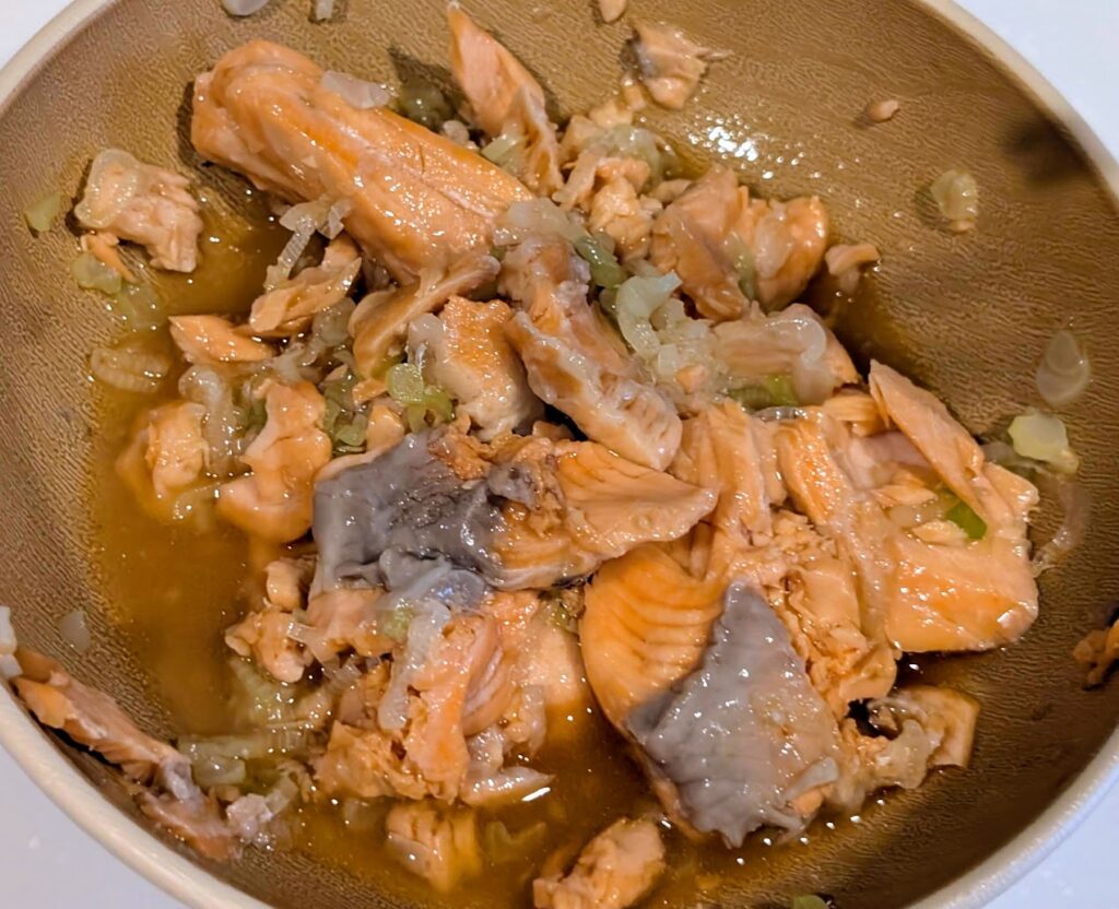 子どもは鮭のサイズは一口サイズでいいので、鮭を崩すように混ぜちゃいました。