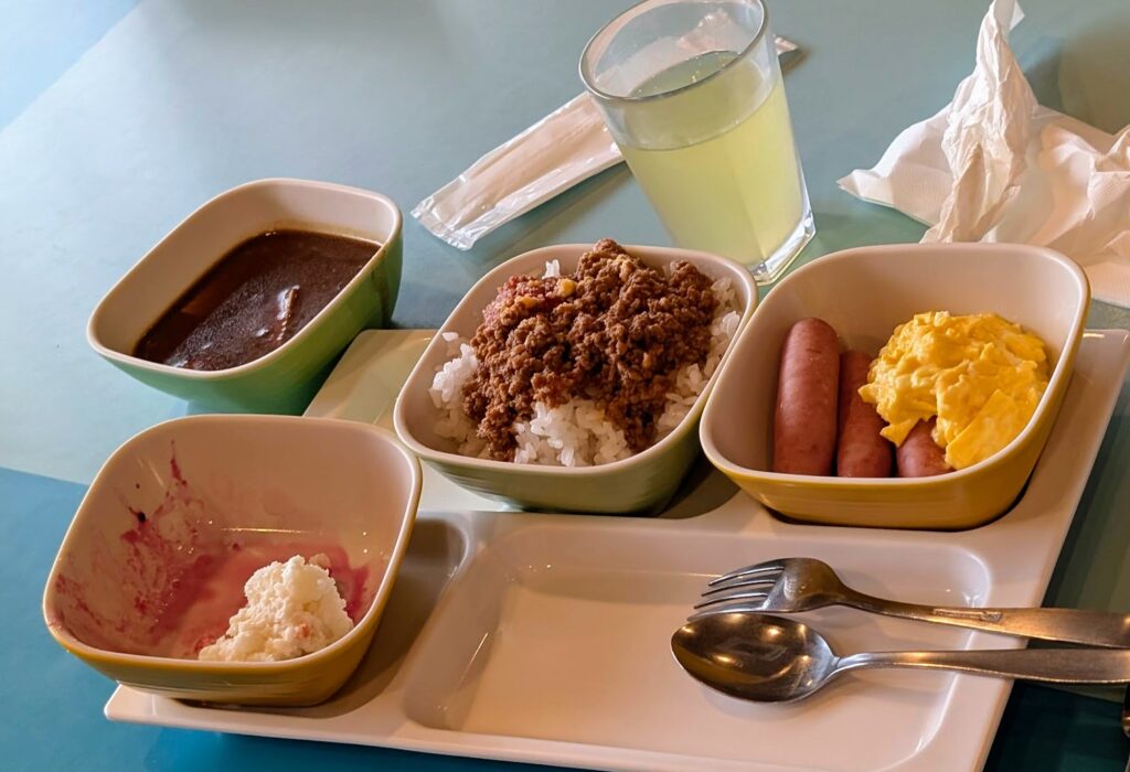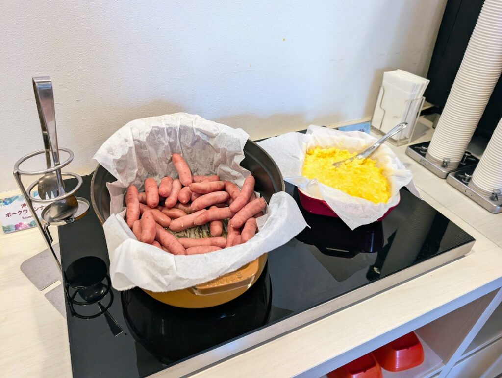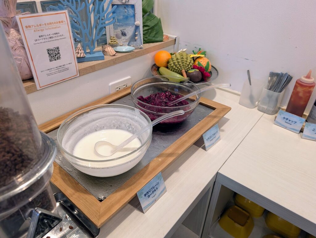 無料朝食だともっと質素なのかなと思っていたのですが、思ったより沖縄の料理を意識してだしてくれていて、子供も食べれるものがあったし、すごく助かりました。
