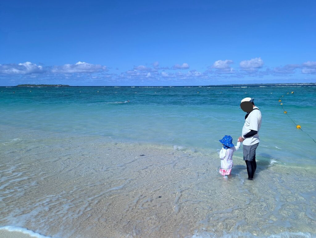 海の水は透明で綺麗で、我が子はお腹くらいまで波がきていましたが、大喜びで楽しんでいました。