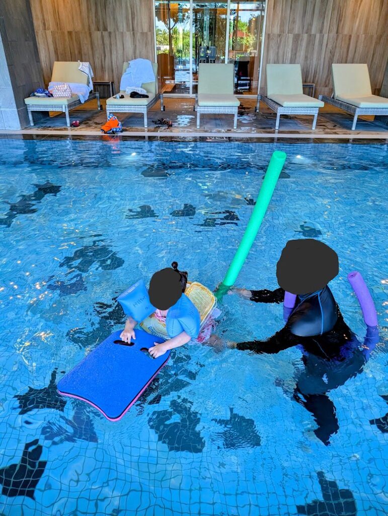 スイマーバを持参したので、子供は沈むことなくバタ足までできるようになりました。