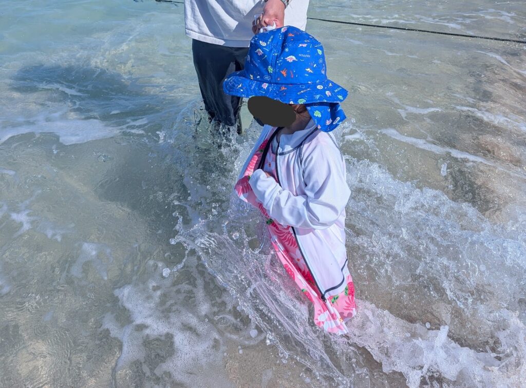 泳ぐのは怖かったので、大人の足首よりちょっと上くらいまで入りました。