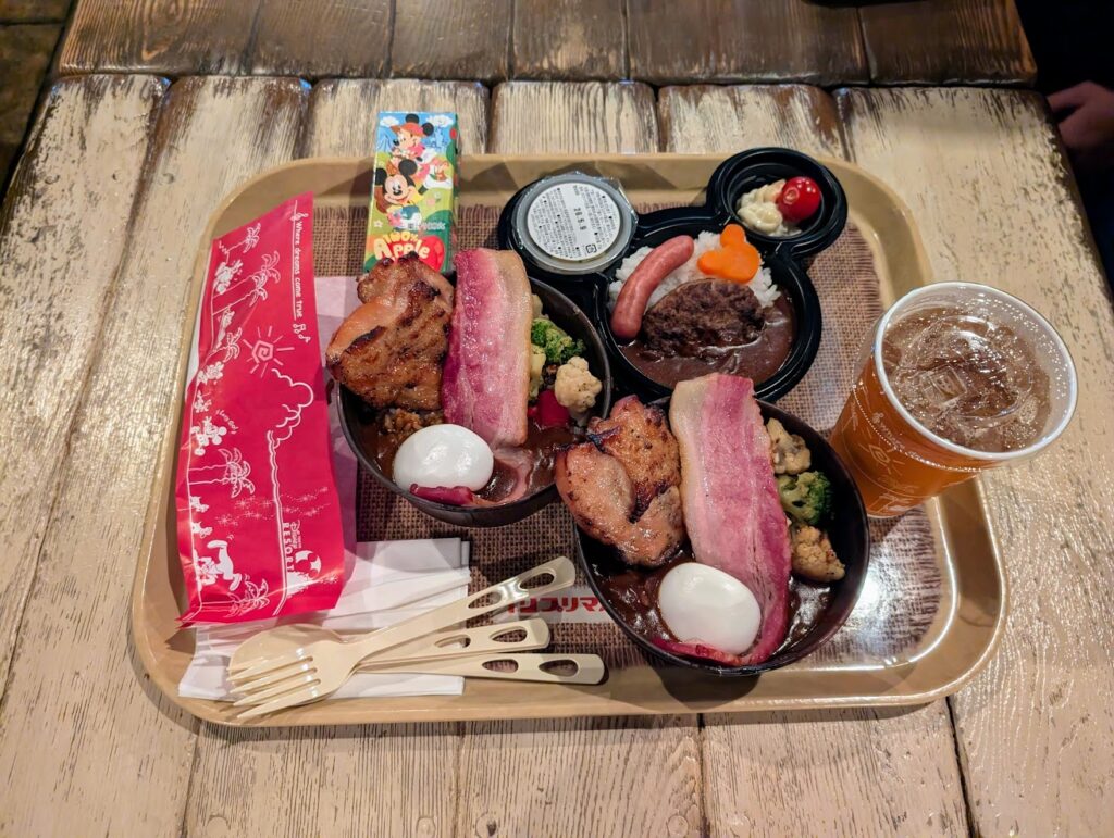 「ハッシュドビーフのユカタンライスボウル(骨付きチキン、ベーコン、エッグ)」を2つ(夫とメニュー被った)、「スパイシースモークチキンレッグ」(私が食べたかった)、「お子様セット」(可愛い)を注文。