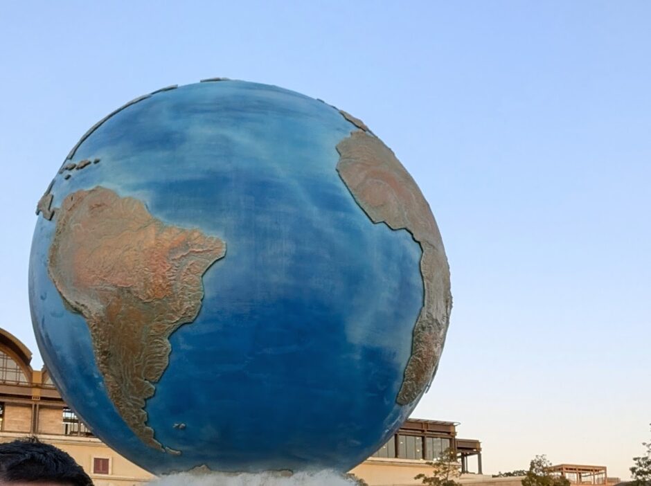 レンタルしたベビーカーを返し、地球儀の前で家族写真を撮って、ホテルに荷物を取りに戻って帰りました。