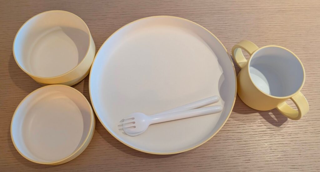 大きな平皿、低めのおわん、ちょっと深めのおわん、コップ、フォークとナイフ。