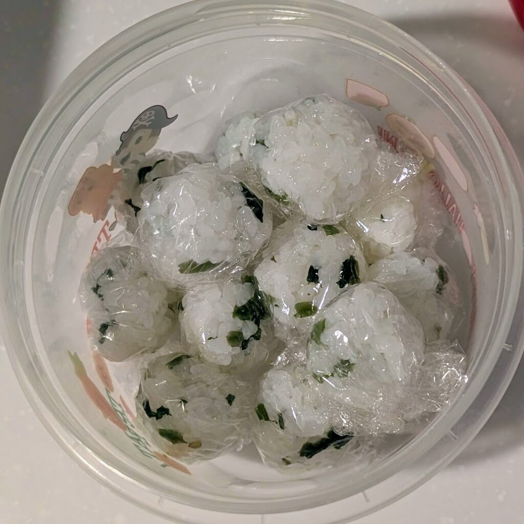 - 野沢菜おにぎり(スーパーのおにぎりを小さく握り直したもの)
