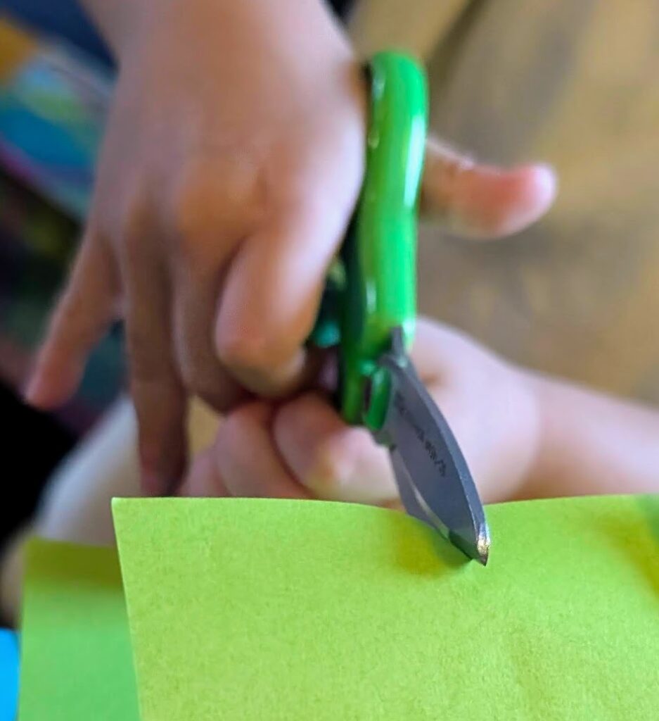 まだ形をつくるのは難しいので、紙を親が持って、子どもがチョキチョキと切れ目を入れるという感じです。
