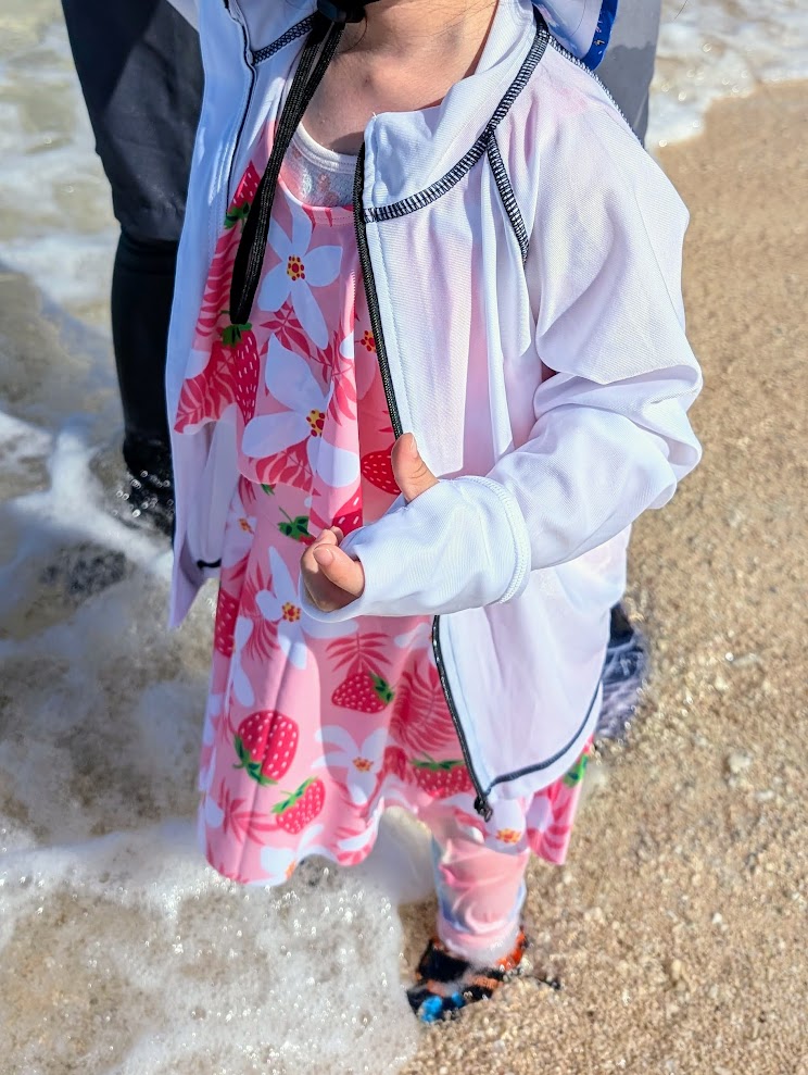 色々と悩んだのですが、今回は水着も新調していまして、このピンクのいちごちゃんだし、本人もラッシュガードは白がいいというので、同じようなものを選びました。