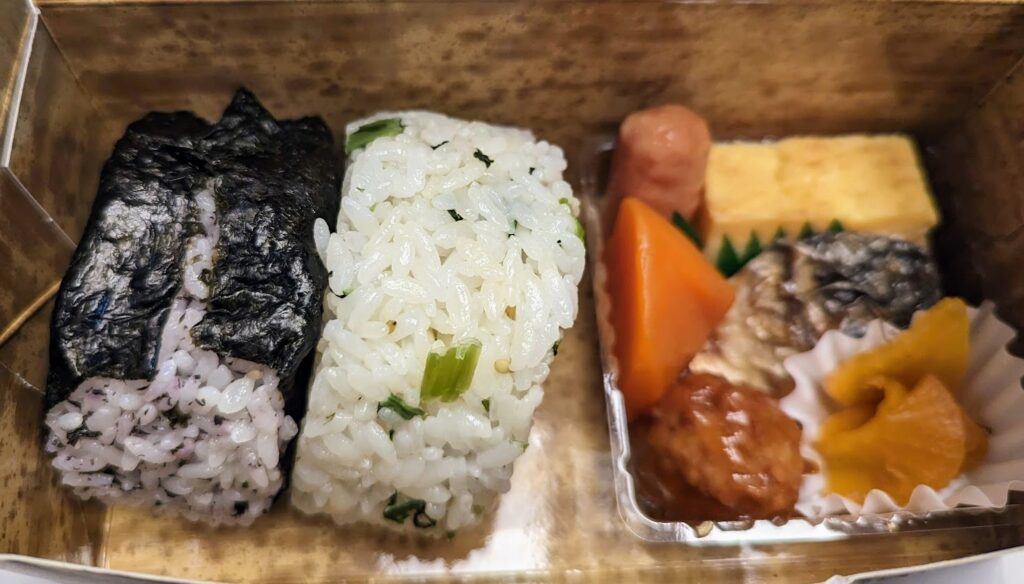 おにぎりが2つ、お魚、煮物、ウィンナー、卵、ミートボール、漬物が入っています。