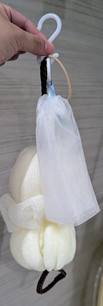 ボディタオルと洗顔用網とヘアゴム(湯船に入るときなどは紙をまとめるため)は別のS字フックでひっかけています。