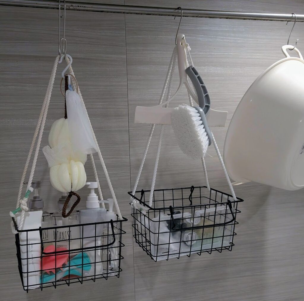 そこで夫がホームセンターでかごを紐を買ってきてくれて、S字フックで物干しバーから吊るしてみることにしました。