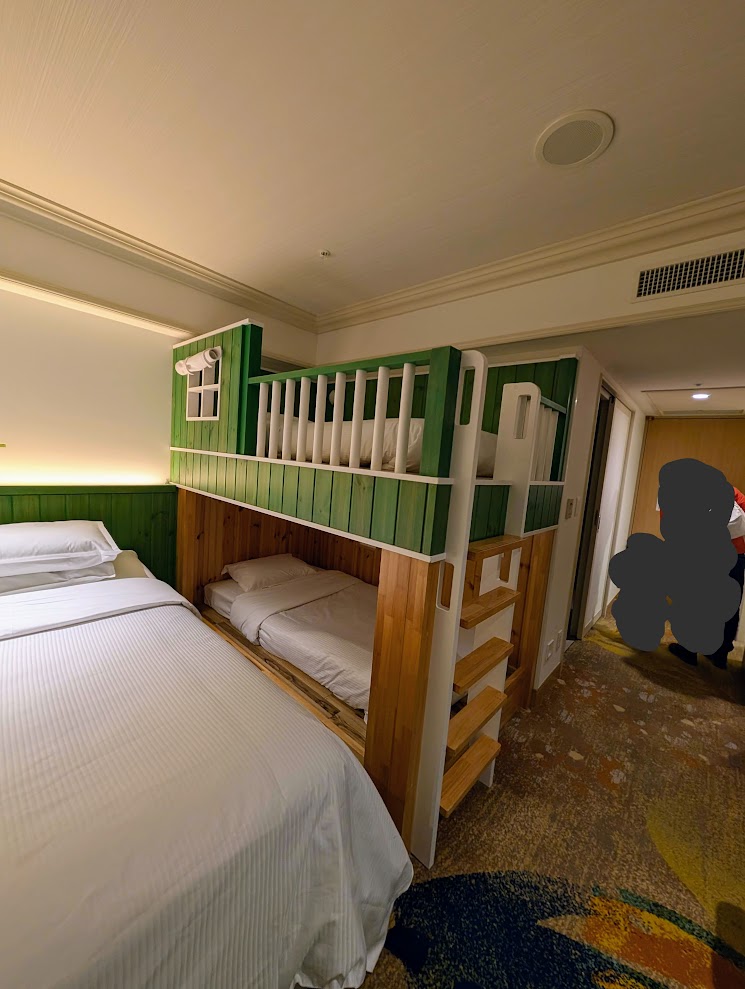 ホテルではいつも絶対一緒に寝るのに、この日は初めて一人で二段ベッドの下の段で寝てくれました。