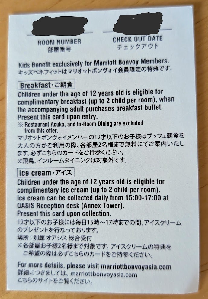 マリオットボンヴォイのメンバーで宿泊した場合、12歳以下の子供がいる場合に、以下のカードをもらえます。