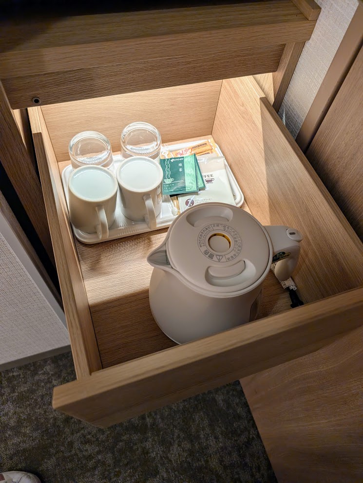 引き出しにはポットとコップ、お茶とコーヒーが入っていました。