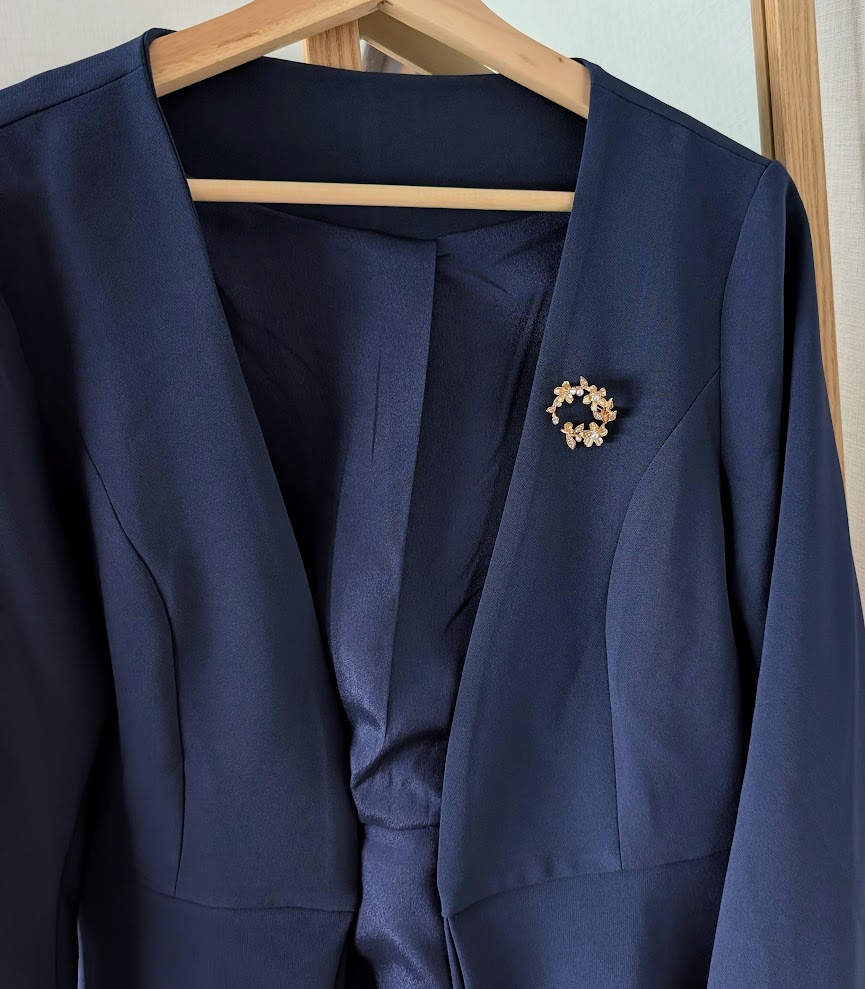それに、私はそこまでフォーマルな服装ではないので、コサージュがしっかりしすぎてもちょっと浮く感じもしたので、もう少しシンプルでもいいかもしれないと思い直しました。